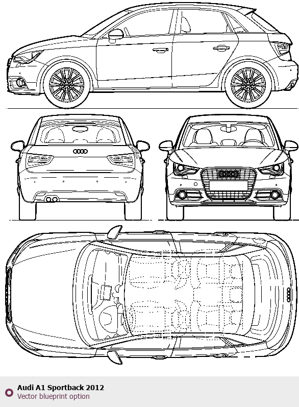 Raster blueprint of the 2012 Audi A1 Sportback Hatchback. This free downloadable image can be used for graphic projects, digital design, and 3D modeling. The file provides accurate exterior proportions of the vehicle. Model year: 2012. Body type: Hatchback.