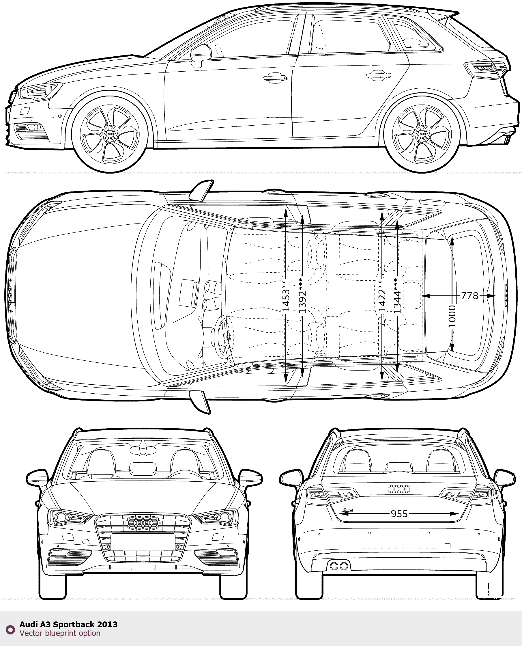 Raster blueprint of the 2013 Audi A3 Sportback Tag. This free downloadable image can be used for graphic projects, digital design, and 3D modeling. The file provides accurate exterior proportions of the vehicle. Model year: 2013. Body type: Tag.
