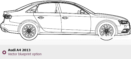 Raster blueprint of the 2013 Audi A4 Tag. This free downloadable image can be used for graphic projects, digital design, and 3D modeling. The file provides accurate exterior proportions of the vehicle. Model year: 2013. Body type: Tag.