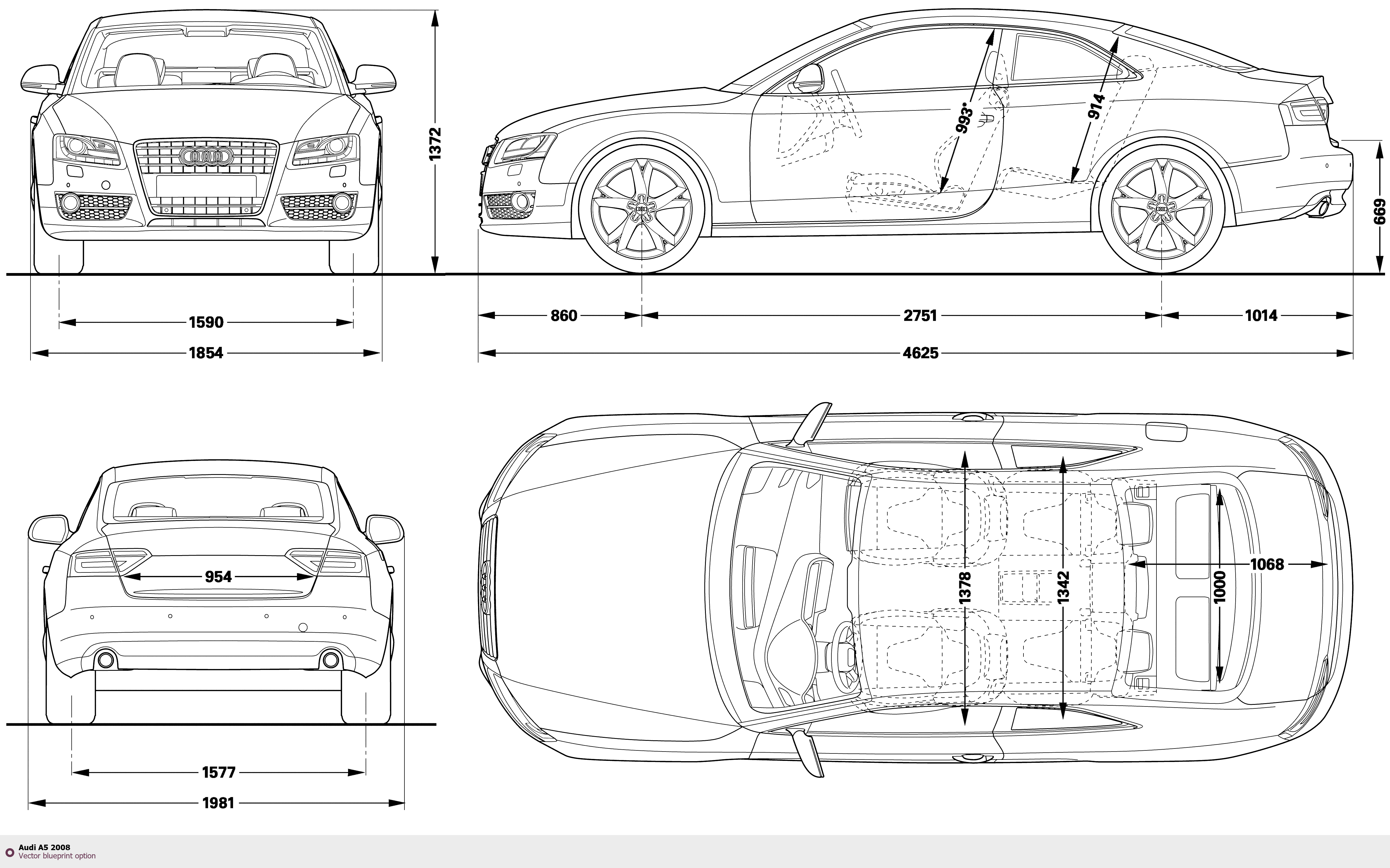 Raster blueprint of the 2008 Audi A5 Tag. This free downloadable image can be used for graphic projects, digital design, and 3D modeling. The file provides accurate exterior proportions of the vehicle. Model year: 2008. Body type: Tag.