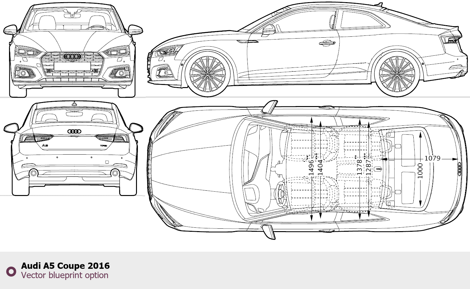 Raster blueprint of the 2016 Audi A5 Coupe Coupe. This free downloadable image can be used for graphic projects, digital design, and 3D modeling. The file provides accurate exterior proportions of the vehicle. Model year: 2016. Body type: Coupe.
