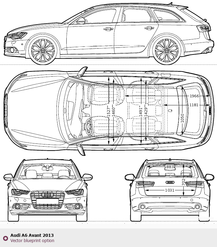 Raster blueprint of the 2013 Audi A6 Avant Tag. This free downloadable image can be used for graphic projects, digital design, and 3D modeling. The file provides accurate exterior proportions of the vehicle. Model year: 2013. Body type: Tag.