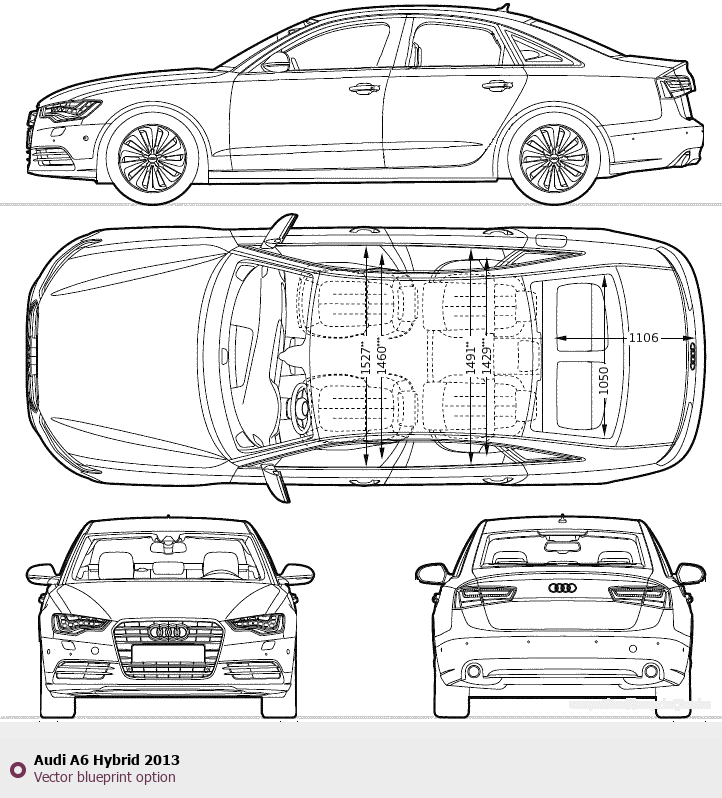 Raster blueprint of the 2013 Audi A6 Hybrid Tag. This free downloadable image can be used for graphic projects, digital design, and 3D modeling. The file provides accurate exterior proportions of the vehicle. Model year: 2013. Body type: Tag.