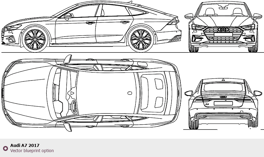 Raster blueprint of the 2017 Audi A7 Hatchback. This free downloadable image can be used for graphic projects, digital design, and 3D modeling. The file provides accurate exterior proportions of the vehicle. Model year: 2017. Body type: Hatchback.
