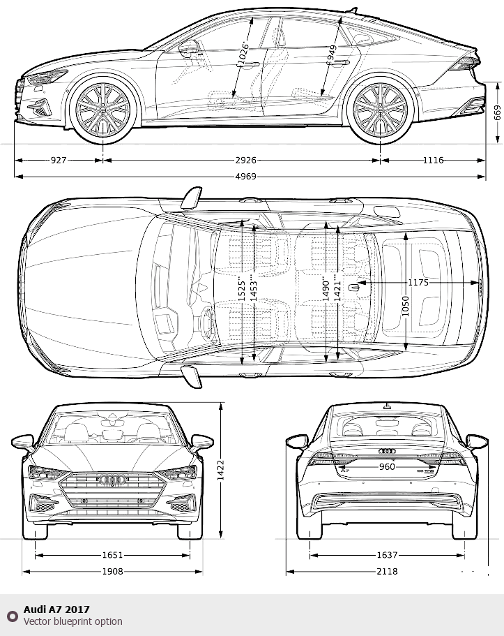 Raster blueprint of the 2017 Audi A7 Hatchback. This free downloadable image can be used for graphic projects, digital design, and 3D modeling. The file provides accurate exterior proportions of the vehicle. Model year: 2017. Body type: Hatchback.