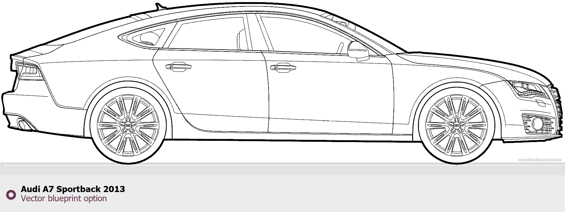 Raster blueprint of the 2013 Audi A7 Sportback Hatchback. This free downloadable image can be used for graphic projects, digital design, and 3D modeling. The file provides accurate exterior proportions of the vehicle. Model year: 2013. Body type: Hatchback.