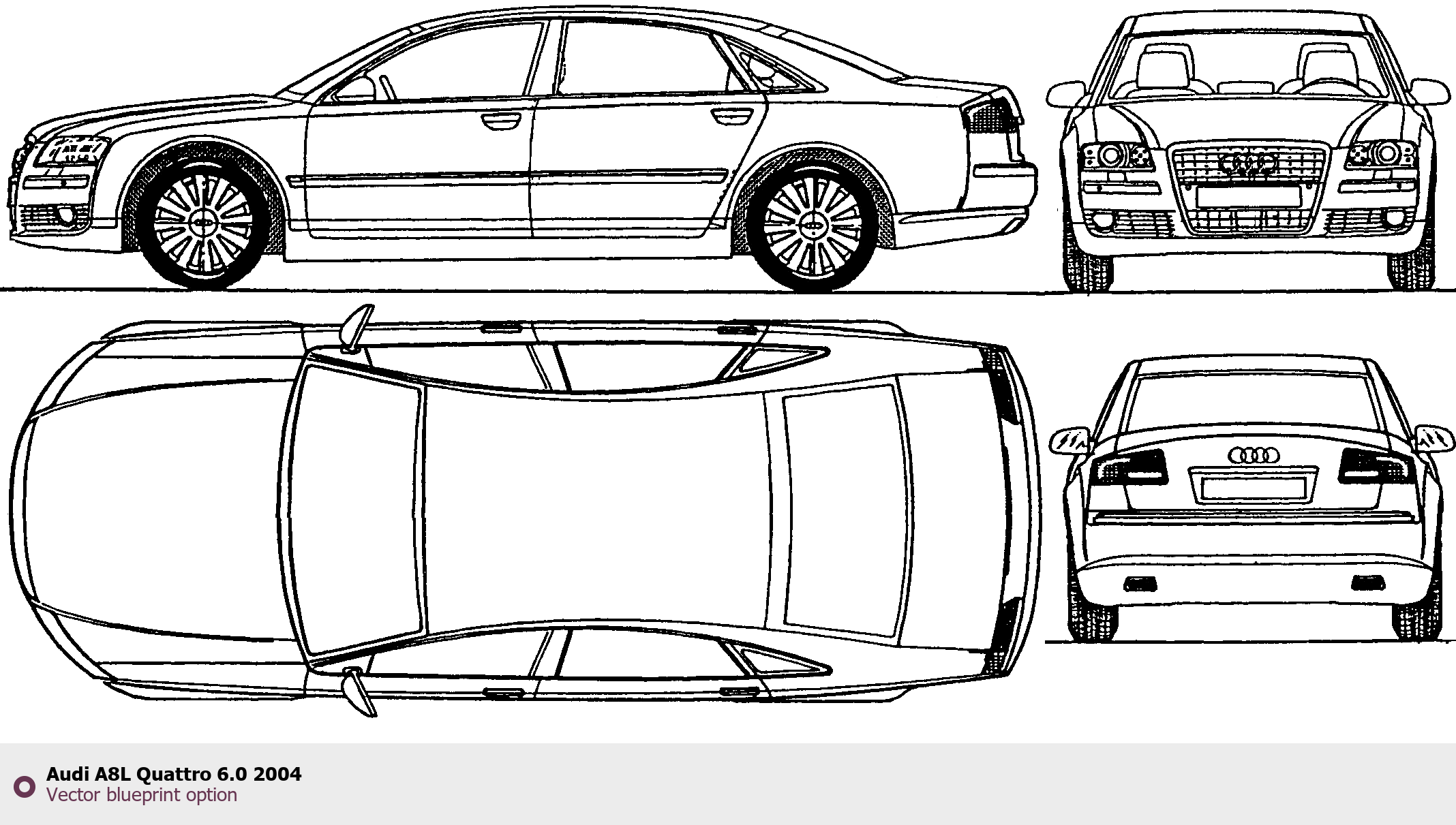 Raster blueprint of the 2004 Audi A8L Quattro 6.0 Sedan. This free downloadable image can be used for graphic projects, digital design, and 3D modeling. The file provides accurate exterior proportions of the vehicle. Model year: 2004. Body type: Sedan.