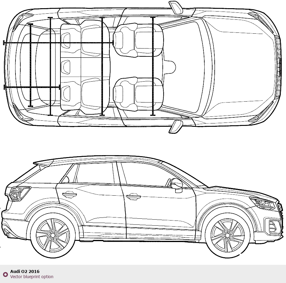 Raster blueprint of the 2016 Audi O2 Tag. This free downloadable image can be used for graphic projects, digital design, and 3D modeling. The file provides accurate exterior proportions of the vehicle. Model year: 2016. Body type: Tag.