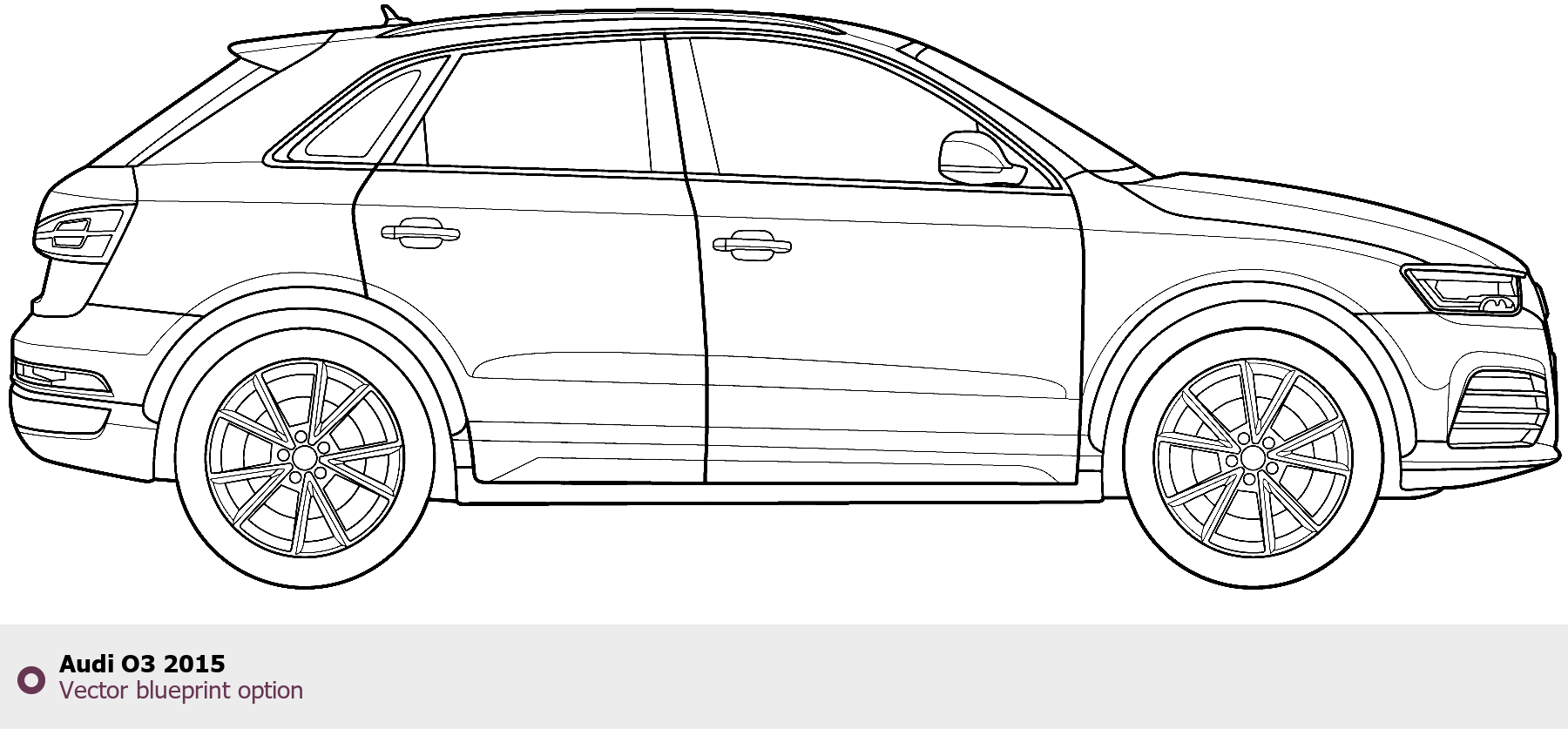 Raster blueprint of the 2015 Audi O3 Tag. This free downloadable image can be used for graphic projects, digital design, and 3D modeling. The file provides accurate exterior proportions of the vehicle. Model year: 2015. Body type: Tag.