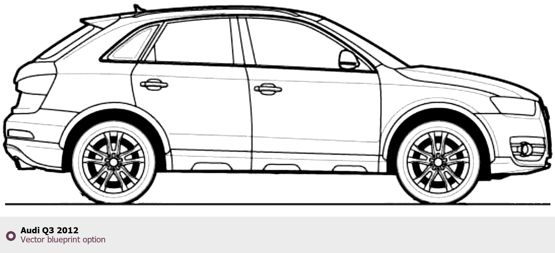 Raster blueprint of the 2012 Audi Q3 Tag. This free downloadable image can be used for graphic projects, digital design, and 3D modeling. The file provides accurate exterior proportions of the vehicle. Model year: 2012. Body type: Tag.