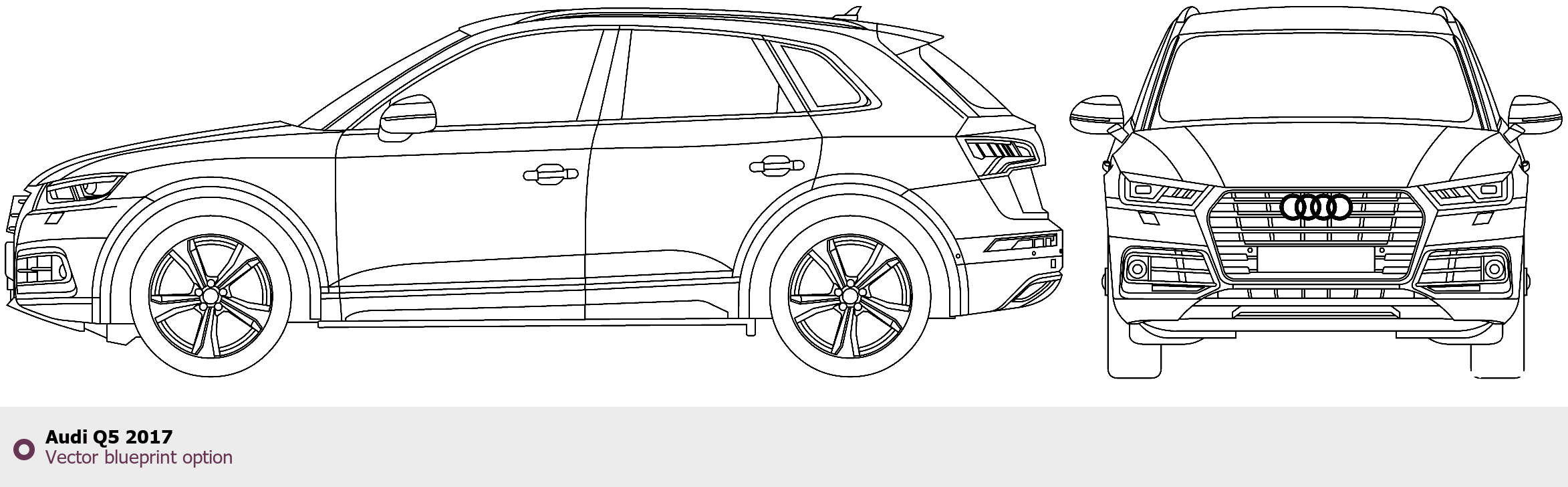 Raster blueprint of the 2017 Audi Q5 SUV. This free downloadable image can be used for graphic projects, digital design, and 3D modeling. The file provides accurate exterior proportions of the vehicle. Model year: 2017. Body type: SUV.