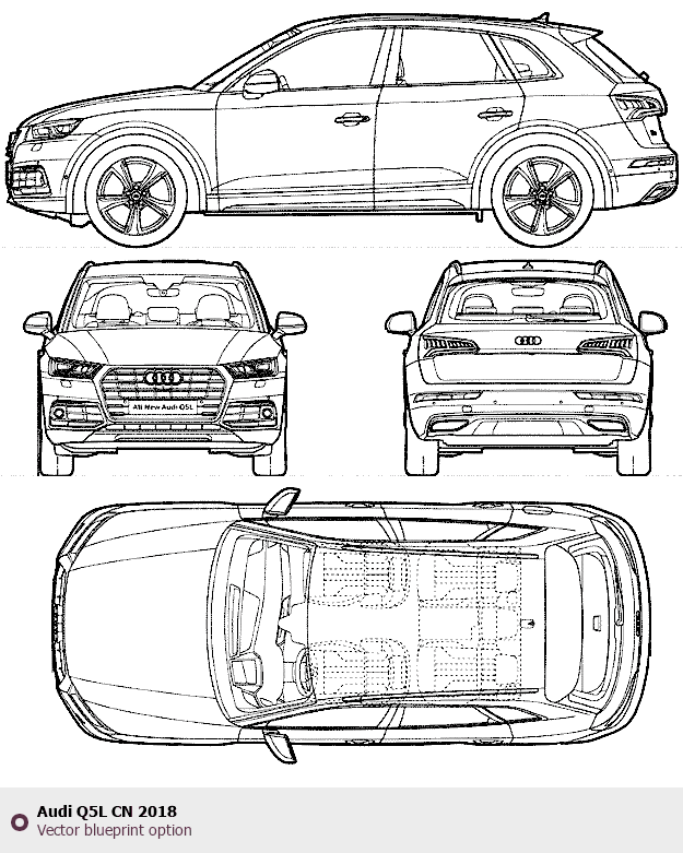 Raster blueprint of the 2018 Audi Q5L CN SUV. This free downloadable image can be used for graphic projects, digital design, and 3D modeling. The file provides accurate exterior proportions of the vehicle. Model year: 2018. Body type: SUV.