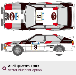 Raster blueprint of the 1982 Audi Quattro Coupe. This free downloadable image can be used for graphic projects, digital design, and 3D modeling. The file provides accurate exterior proportions of the vehicle. Model year: 1982. Body type: Coupe.