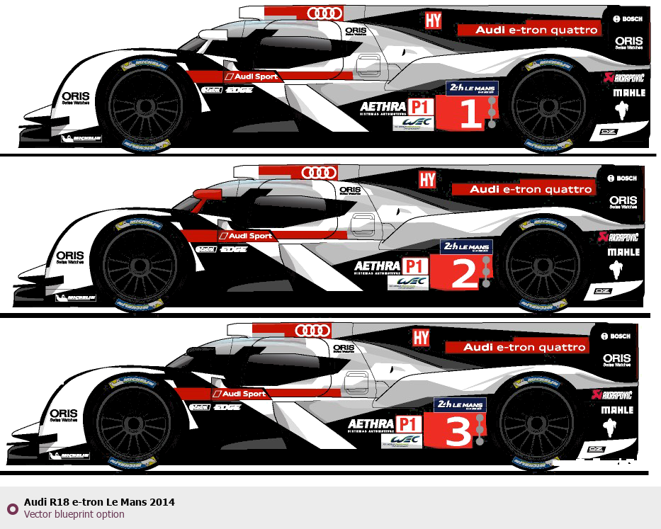 Raster blueprint of the 2014 Audi R18 e-tron Le Mans Tag. This free downloadable image can be used for graphic projects, digital design, and 3D modeling. The file provides accurate exterior proportions of the vehicle. Model year: 2014. Body type: Tag.