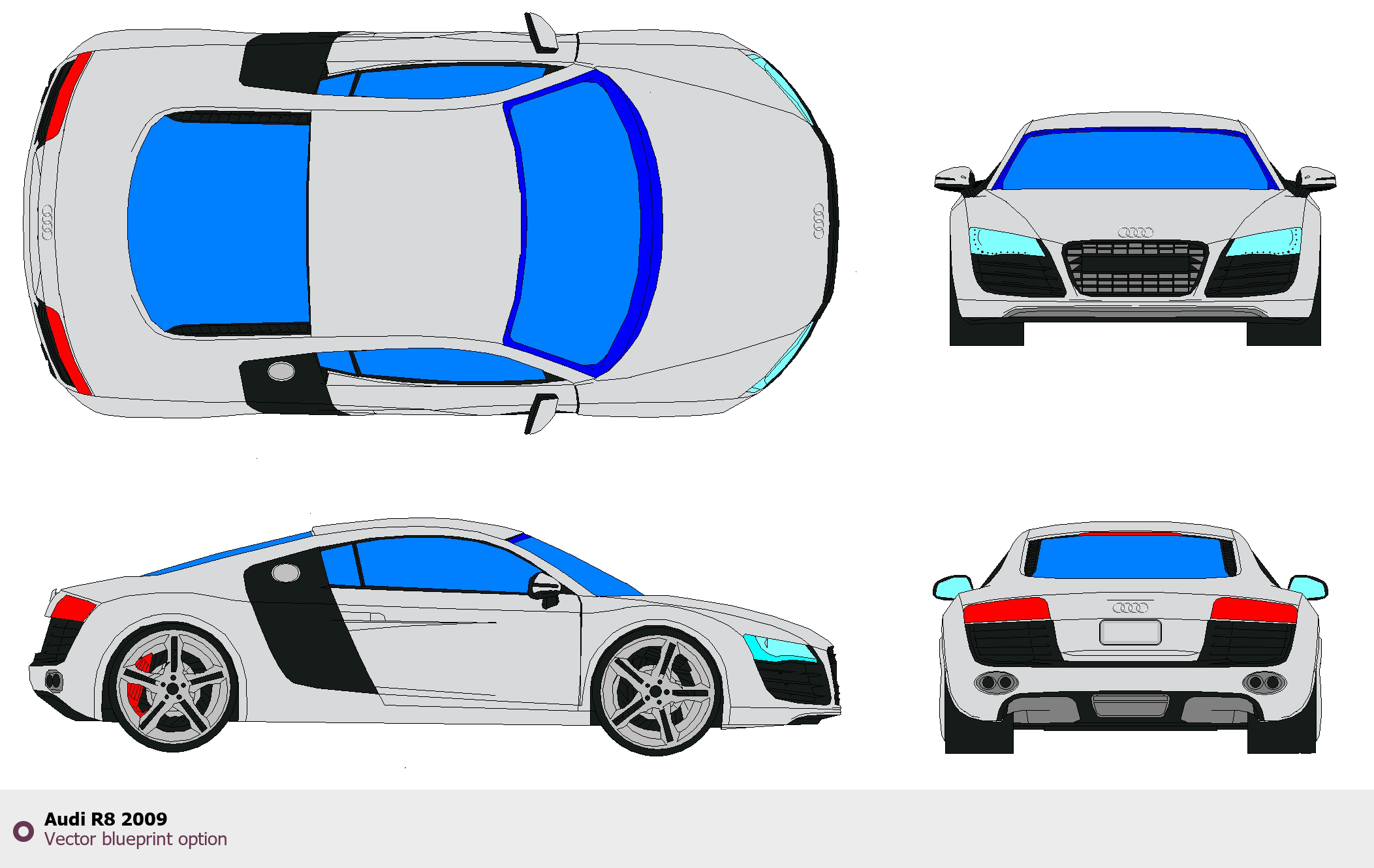 Raster blueprint of the 2009 Audi R8 Tag. This free downloadable image can be used for graphic projects, digital design, and 3D modeling. The file provides accurate exterior proportions of the vehicle. Model year: 2009. Body type: Tag.