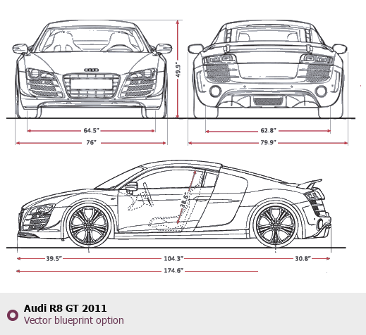 Raster blueprint of the 2011 Audi R8 GT Tag. This free downloadable image can be used for graphic projects, digital design, and 3D modeling. The file provides accurate exterior proportions of the vehicle. Model year: 2011. Body type: Tag.