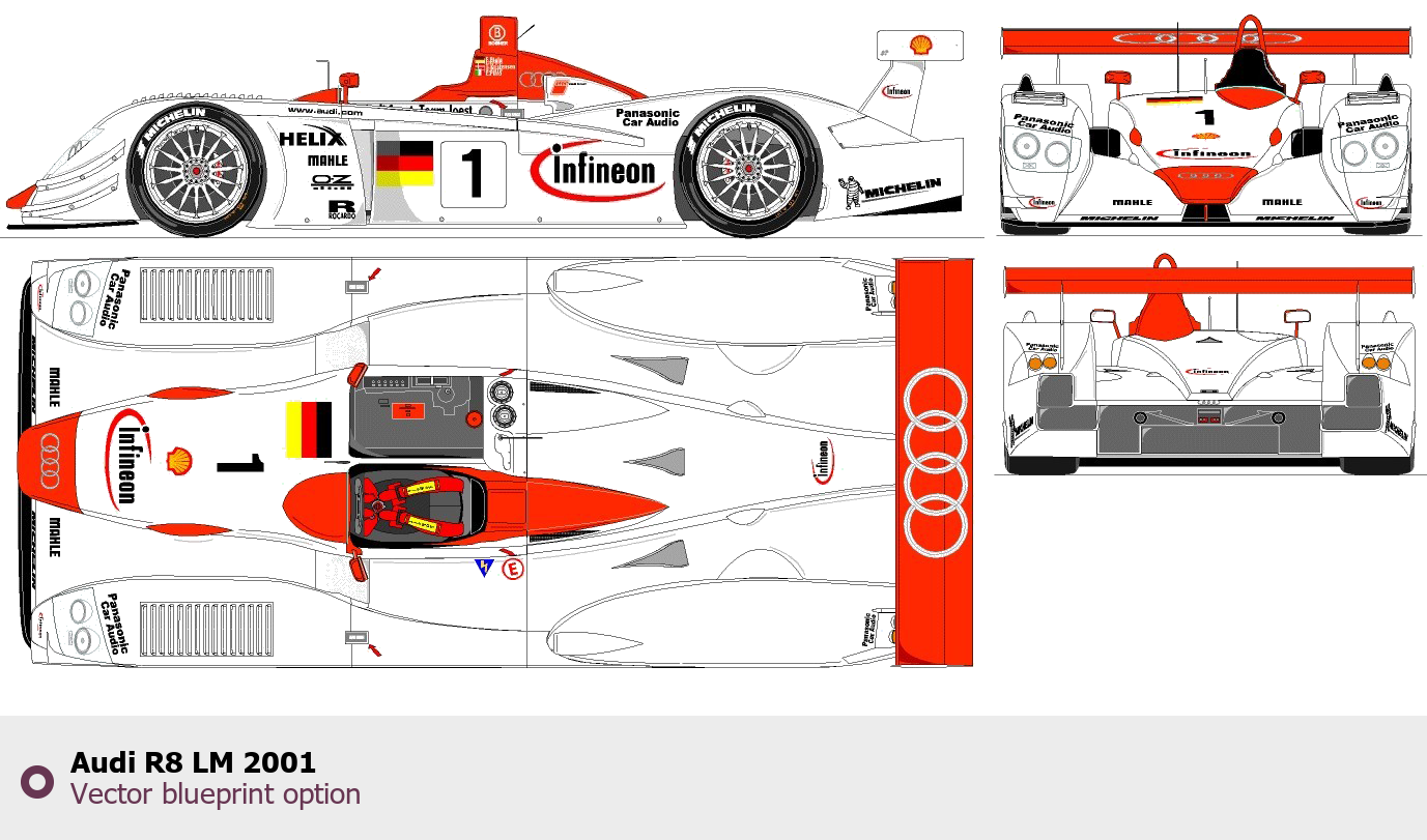 Raster blueprint of the 2001 Audi R8 LM Tag. This free downloadable image can be used for graphic projects, digital design, and 3D modeling. The file provides accurate exterior proportions of the vehicle. Model year: 2001. Body type: Tag.