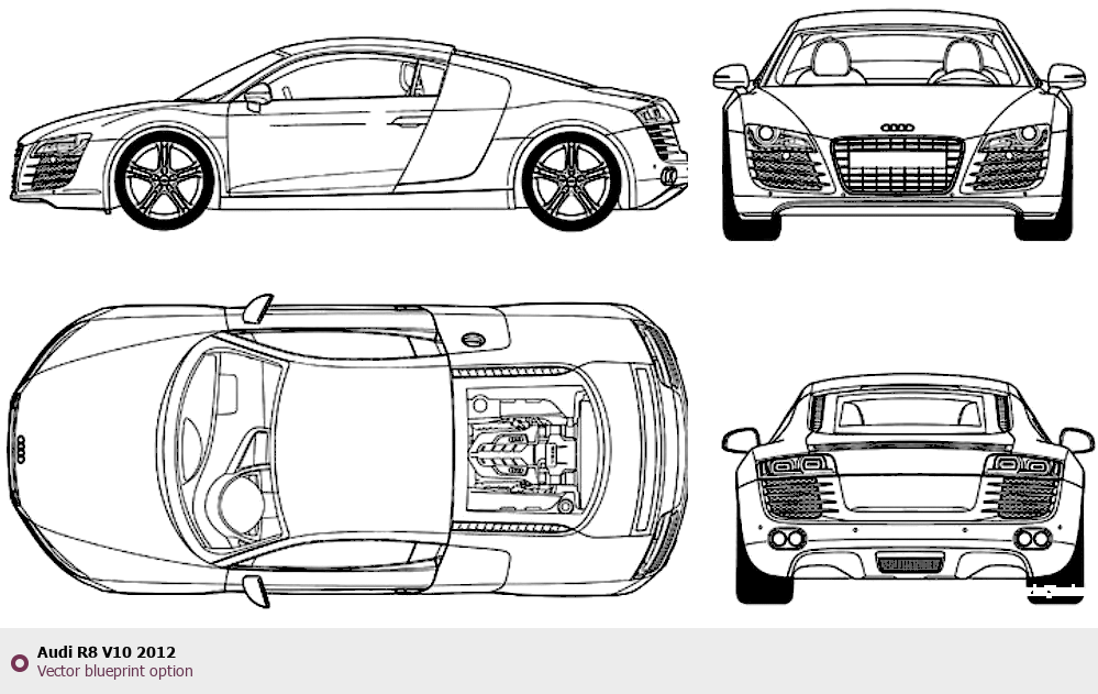 Raster blueprint of the 2012 Audi R8 V10 Tag. This free downloadable image can be used for graphic projects, digital design, and 3D modeling. The file provides accurate exterior proportions of the vehicle. Model year: 2012. Body type: Tag.