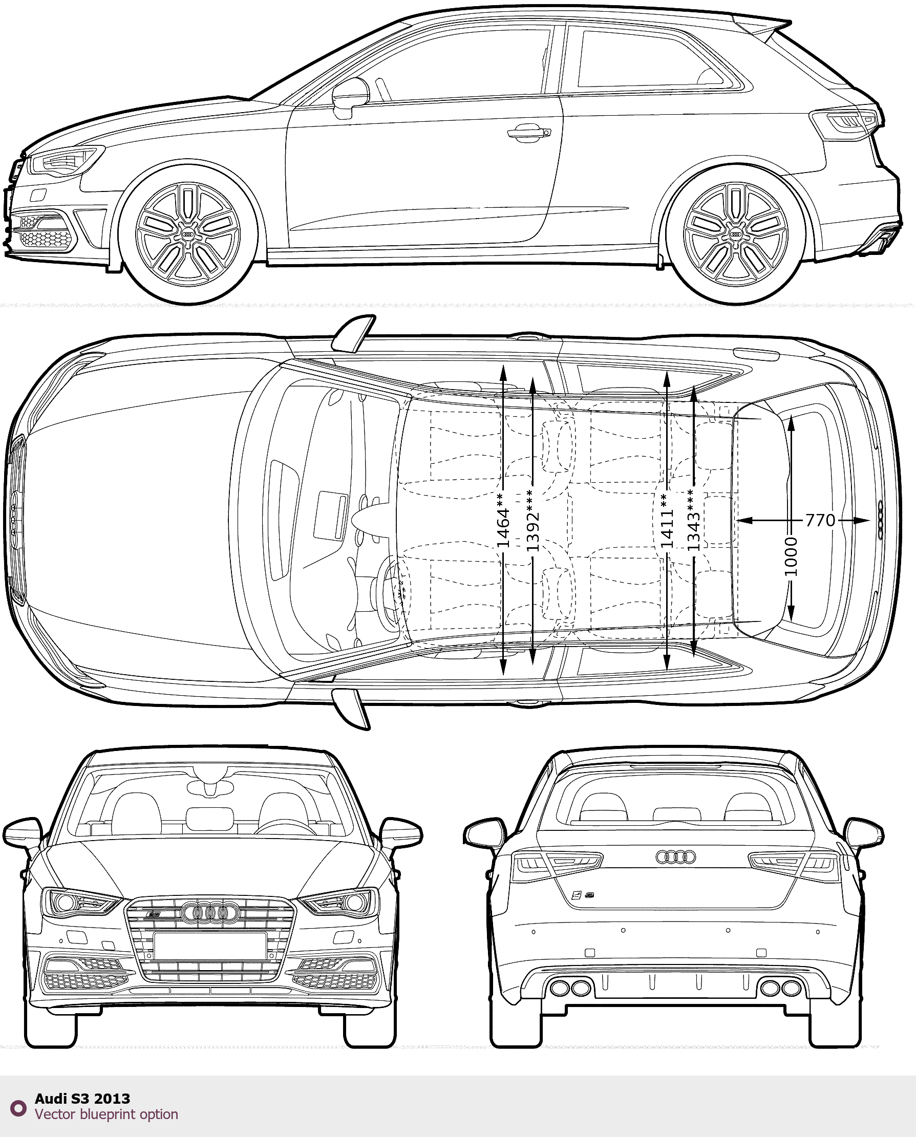 Raster blueprint of the 2013 Audi S3 Tag. This free downloadable image can be used for graphic projects, digital design, and 3D modeling. The file provides accurate exterior proportions of the vehicle. Model year: 2013. Body type: Tag.