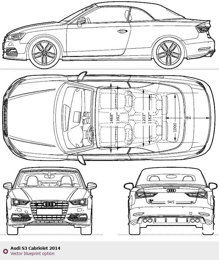 Raster blueprint of the 2014 Audi S3 Cabriolet Cabriolet. This free downloadable image can be used for graphic projects, digital design, and 3D modeling. The file provides accurate exterior proportions of the vehicle. Model year: 2014. Body type: Cabriolet.