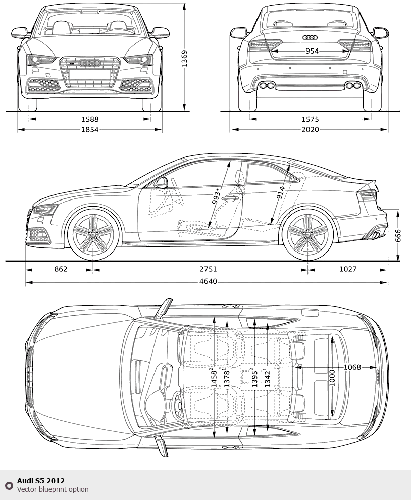Raster blueprint of the 2012 Audi S5 Tag. This free downloadable image can be used for graphic projects, digital design, and 3D modeling. The file provides accurate exterior proportions of the vehicle. Model year: 2012. Body type: Tag.