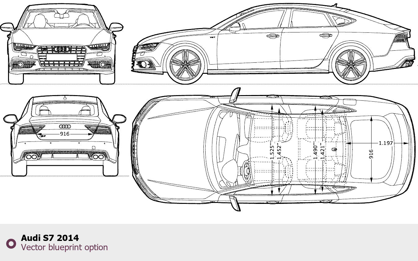 Raster blueprint of the 2014 Audi S7 Hatchback. This free downloadable image can be used for graphic projects, digital design, and 3D modeling. The file provides accurate exterior proportions of the vehicle. Model year: 2014. Body type: Hatchback.
