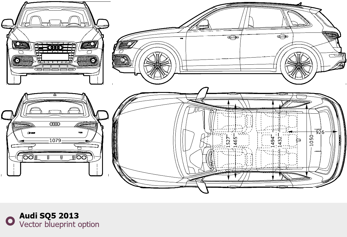 Raster blueprint of the 2013 Audi SQ5 SUV. This free downloadable image can be used for graphic projects, digital design, and 3D modeling. The file provides accurate exterior proportions of the vehicle. Model year: 2013. Body type: SUV.