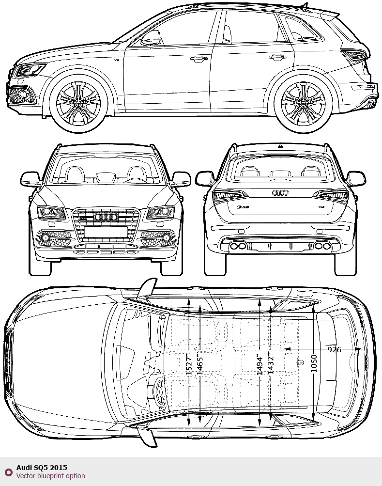 Raster blueprint of the 2015 Audi SQ5 SUV. This free downloadable image can be used for graphic projects, digital design, and 3D modeling. The file provides accurate exterior proportions of the vehicle. Model year: 2015. Body type: SUV.