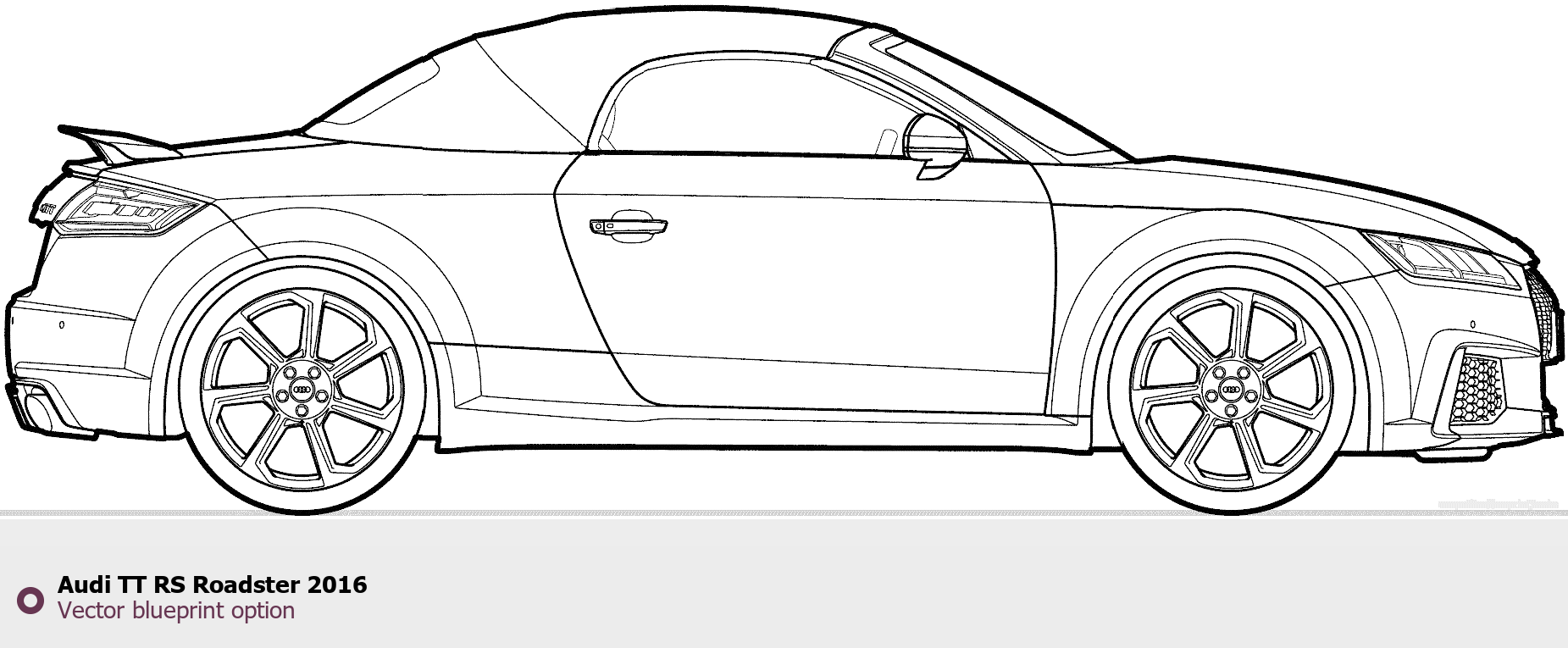 Raster blueprint of the 2016 Audi TT RS Roadster Roadster. This free downloadable image can be used for graphic projects, digital design, and 3D modeling. The file provides accurate exterior proportions of the vehicle. Model year: 2016. Body type: Roadster.