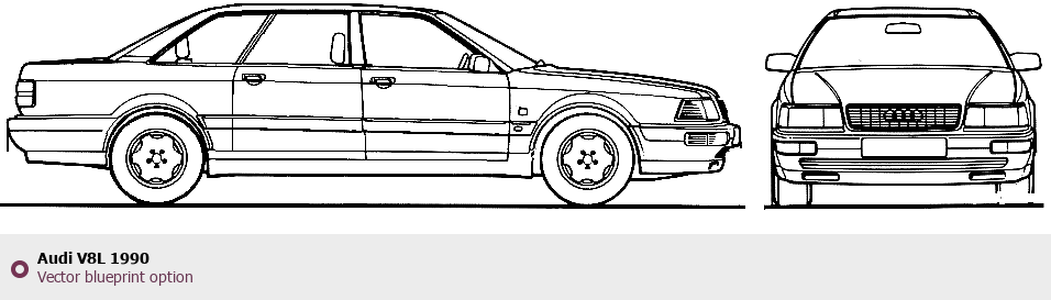 Raster blueprint of the 1990 Audi V8L Sedan. This free downloadable image can be used for graphic projects, digital design, and 3D modeling. The file provides accurate exterior proportions of the vehicle. Model year: 1990. Body type: Sedan.