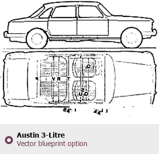 Raster blueprint of the Austin 3-Litre Tag. This free downloadable image can be used for graphic projects, digital design, and 3D modeling. The file provides accurate exterior proportions of the vehicle. Body type: Tag.