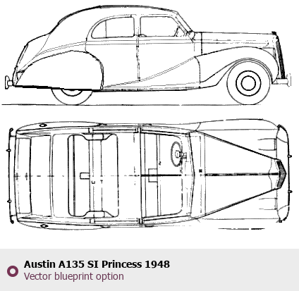 Raster blueprint of the 1948 Austin A135 SI Princess Tag. This free downloadable image can be used for graphic projects, digital design, and 3D modeling. The file provides accurate exterior proportions of the vehicle. Model year: 1948. Body type: Tag.