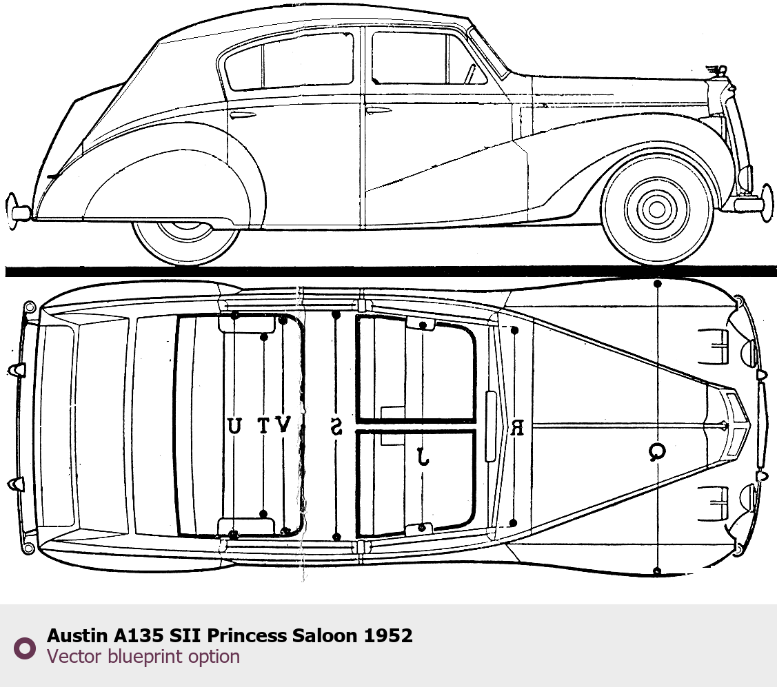 Raster blueprint of the 1952 Austin A135 SII Princess Saloon Sedan. This free downloadable image can be used for graphic projects, digital design, and 3D modeling. The file provides accurate exterior proportions of the vehicle. Model year: 1952. Body type: Sedan.