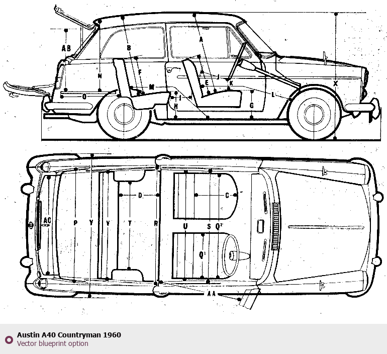 Raster blueprint of the 1960 Austin A40 Countryman Tag. This free downloadable image can be used for graphic projects, digital design, and 3D modeling. The file provides accurate exterior proportions of the vehicle. Model year: 1960. Body type: Tag.