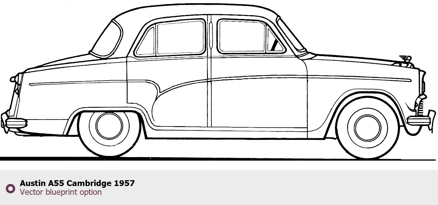 Raster blueprint of the 1957 Austin A55 Cambridge Sedan. This free downloadable image can be used for graphic projects, digital design, and 3D modeling. The file provides accurate exterior proportions of the vehicle. Model year: 1957. Body type: Sedan.