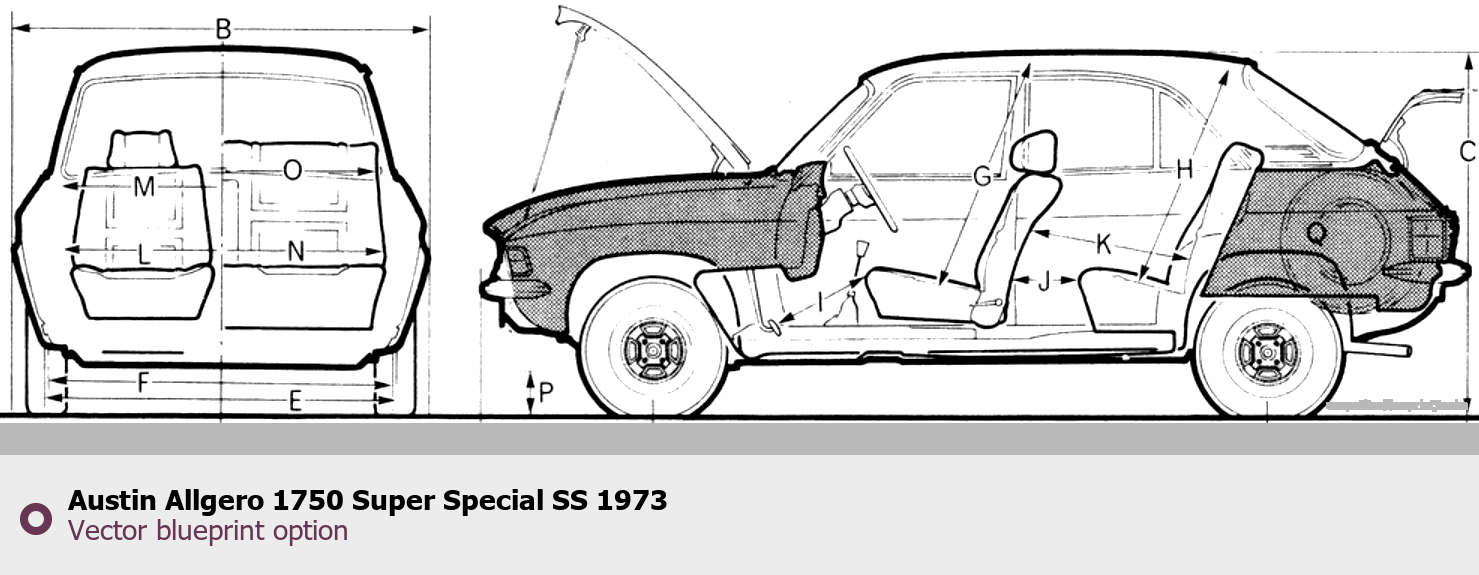 Raster blueprint of the Austin Allgero 1750 Super Special SS 1973 Sedan. This free downloadable image can be used for graphic projects, digital design, and 3D modeling. The file provides accurate exterior proportions of the vehicle. Body type: Sedan.