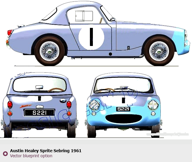 Raster blueprint of the 1961 Austin Healey Sprite Sebring Tag. This free downloadable image can be used for graphic projects, digital design, and 3D modeling. The file provides accurate exterior proportions of the vehicle. Model year: 1961. Body type: Tag.
