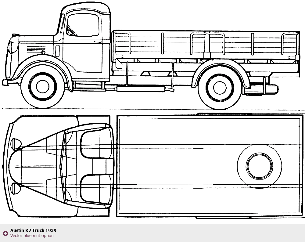 Raster blueprint of the 1939 Austin K2 Truck Heavy Truck. This free downloadable image can be used for graphic projects, digital design, and 3D modeling. The file provides accurate exterior proportions of the vehicle. Model year: 1939. Body type: Heavy Truck.