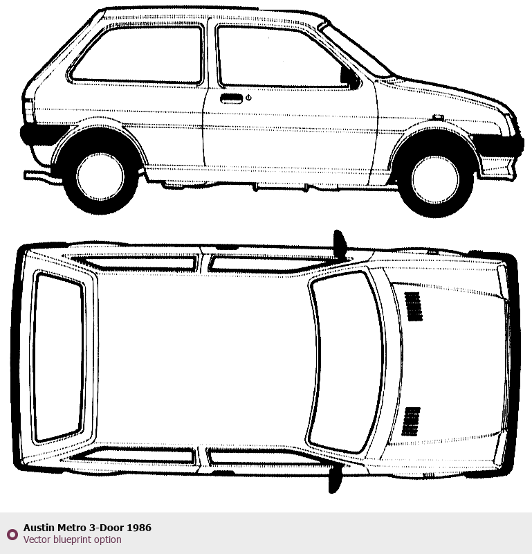 Raster blueprint of the 1986 Austin Metro 3-Door Tag. This free downloadable image can be used for graphic projects, digital design, and 3D modeling. The file provides accurate exterior proportions of the vehicle. Model year: 1986. Body type: Tag.