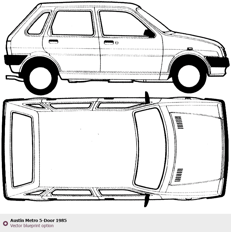 Raster blueprint of the 1985 Austin Metro 5-Door Tag. This free downloadable image can be used for graphic projects, digital design, and 3D modeling. The file provides accurate exterior proportions of the vehicle. Model year: 1985. Body type: Tag.
