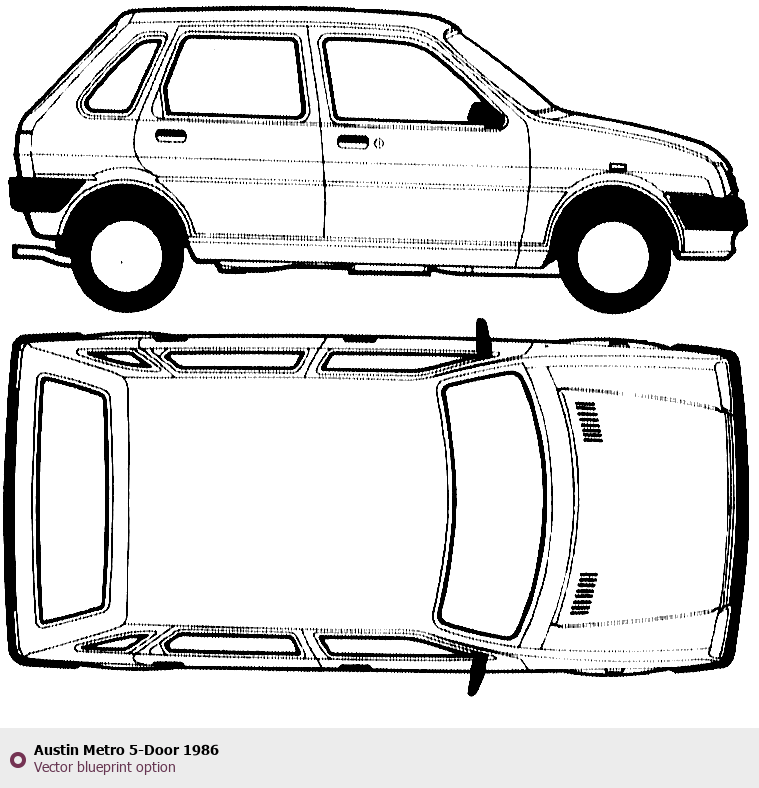 Raster blueprint of the 1986 Austin Metro 5-Door Tag. This free downloadable image can be used for graphic projects, digital design, and 3D modeling. The file provides accurate exterior proportions of the vehicle. Model year: 1986. Body type: Tag.