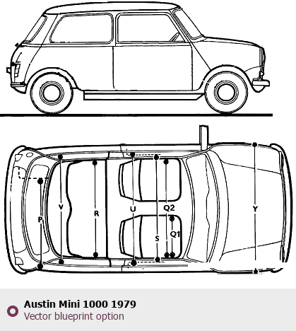 Raster blueprint of the 1979 Austin Mini 1000 Hatchback. This free downloadable image can be used for graphic projects, digital design, and 3D modeling. The file provides accurate exterior proportions of the vehicle. Model year: 1979. Body type: Hatchback.