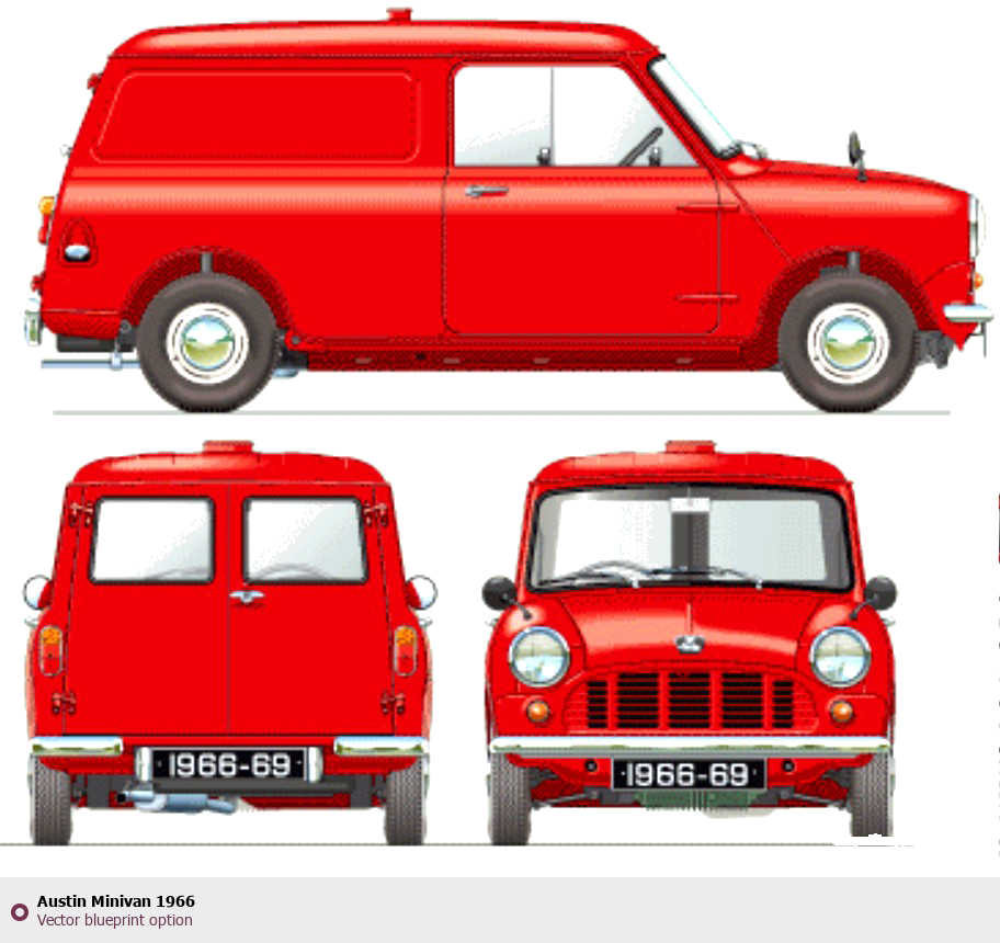 Raster blueprint of the 1966 Austin Minivan Hatchback. This free downloadable image can be used for graphic projects, digital design, and 3D modeling. The file provides accurate exterior proportions of the vehicle. Model year: 1966. Body type: Hatchback.
