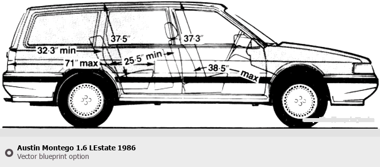 Raster blueprint of the 1986 Austin Montego 1.6 LEstate Tag. This free downloadable image can be used for graphic projects, digital design, and 3D modeling. The file provides accurate exterior proportions of the vehicle. Model year: 1986. Body type: Tag.