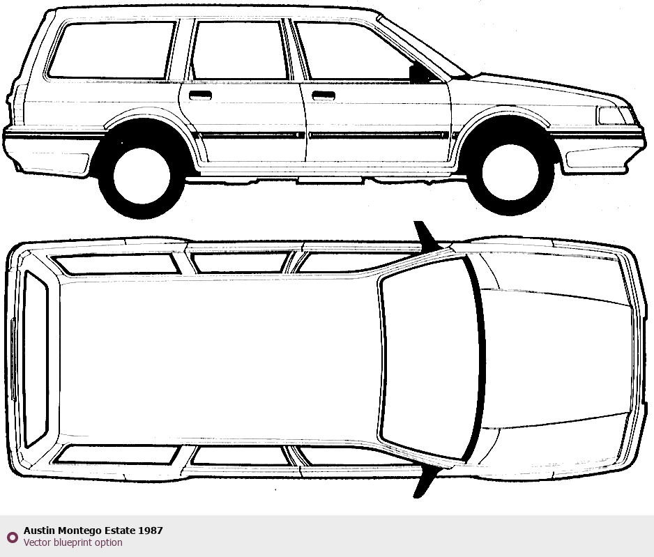 Raster blueprint of the 1987 Austin Montego Estate Wagon. This free downloadable image can be used for graphic projects, digital design, and 3D modeling. The file provides accurate exterior proportions of the vehicle. Model year: 1987. Body type: Wagon.