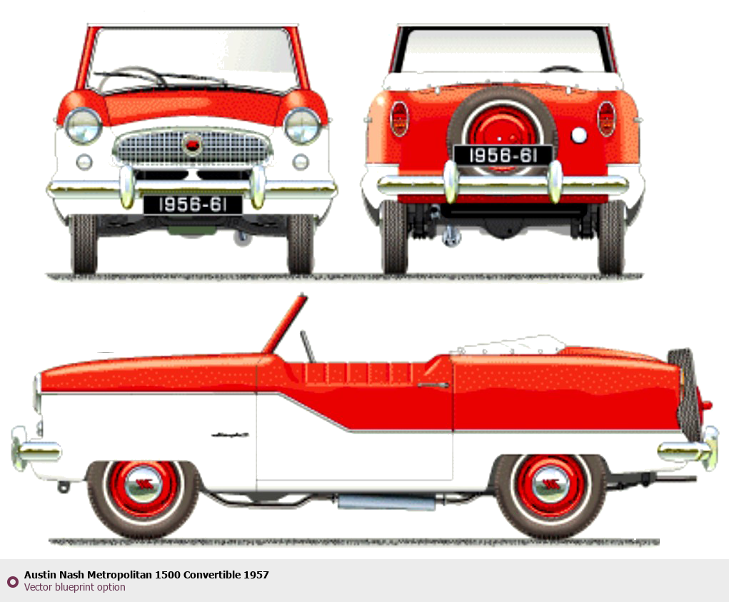 Raster blueprint of the 1957 Austin Nash Metropolitan 1500 Convertible Cabriolet. This free downloadable image can be used for graphic projects, digital design, and 3D modeling. The file provides accurate exterior proportions of the vehicle. Model year: 1957. Body type: Cabriolet.