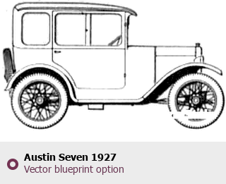 Raster blueprint of the 1927 Austin Seven Sedan. This free downloadable image can be used for graphic projects, digital design, and 3D modeling. The file provides accurate exterior proportions of the vehicle. Model year: 1927. Body type: Sedan.