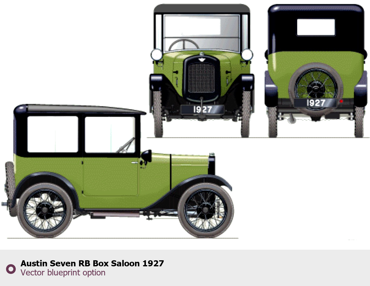 Raster blueprint of the 1927 Austin Seven RB Box Saloon Sedan. This free downloadable image can be used for graphic projects, digital design, and 3D modeling. The file provides accurate exterior proportions of the vehicle. Model year: 1927. Body type: Sedan.