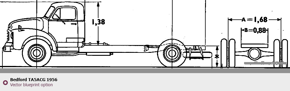 Raster blueprint of the 1956 Bedford TA5ACG Tag. This free downloadable image can be used for graphic projects, digital design, and 3D modeling. The file provides accurate exterior proportions of the vehicle. Model year: 1956. Body type: Tag.