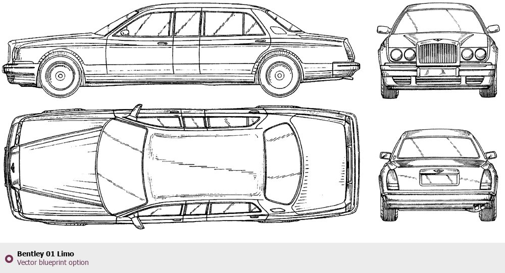 Raster blueprint of the Bentley 01 Limo Limousine. This free downloadable image can be used for graphic projects, digital design, and 3D modeling. The file provides accurate exterior proportions of the vehicle. Body type: Limousine.